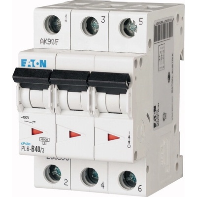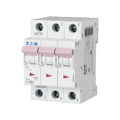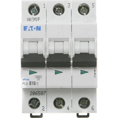 Jistič EATON PL6 10A B/3 Parametry: Montáž: DIN lišta / TH 35mm Spouštěcí charakteristika: B Jmenovité napětí: 400V AC Jmenovitý proud: 10 A Zkratová odolnost: 6 kA...
