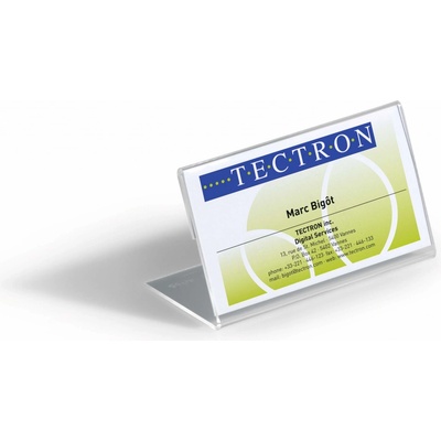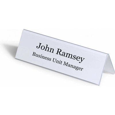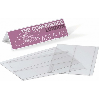 Oboustranně čitelná stolní jmenovka z pevného PVC, vhodná na konference, recepční pulty, ceny zboží a popis produktů. Dodávána s vyměnitelnou prázdnou kartou. Větší balení 25 ks. Rozměry: 52x100 mm Výrobce: Durable