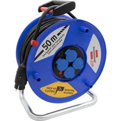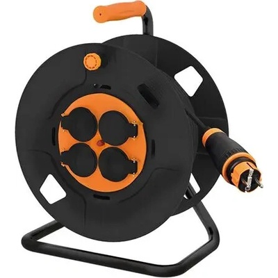 Venkovní prodlužovací kabel na bubnu 50 m, 4 zásuvky, černý, guma-neopren, 230 V, 1,5 mm2. Jeho výhodami jsou odolné kovové tělo, vodicí oko pro plynulé navinutí kabelu a brzda...