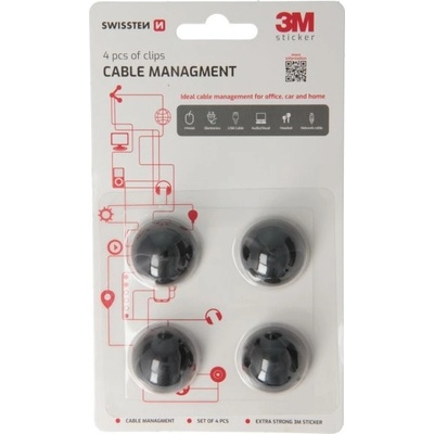 Swissten kabelový managment - klipy na kabely, 4ks (2 druhy po 2 kusech), Materiál: plast, Max. průměr kabelu: 9 mm, 3M samolepka, Univerzální využití. Baleno v blistru...