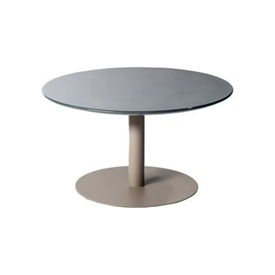Konferenční stolek T-Table značky Tribu s rámem z lakované nerezové oceli a s deskou stolu z teaku, keramiky nebo z glazovaného lávového kamene.