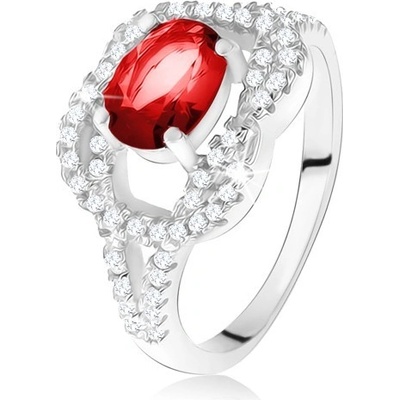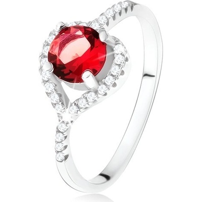 Prsten ze stříbra 925, ramena zatočená do uzlu, čiré kamínky a větší zirkon červené barvy.
