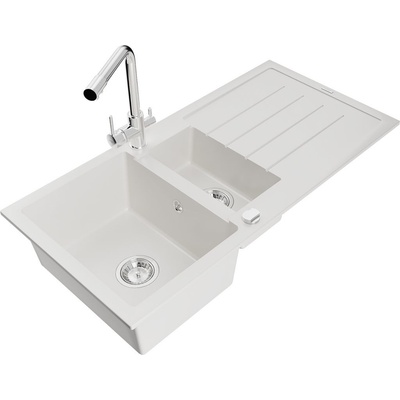 Technické údaje: Dřez: Rozměr: 1000x500x200 mm Hloubka komory: 190 mm (větší), 115 mm (menší) Rozměry komory: 430x330 mm (větší), 340x170 mm (menší) Průměr odtoku: ø90 mm Typ: 1,5-komorový s odkapávačem Druh: Vestavný do desky Barva: Bílá Úprava sifonu: Chrom Materiál:...