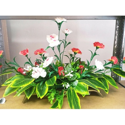 Ikebana z karafiátů, růží a zelených listů na plastovém podstavci. Ručně vyrobeno s láskou jako pietní dekorace na hrob. Ikebana karafiát, růže a listy je umělecká květinová...