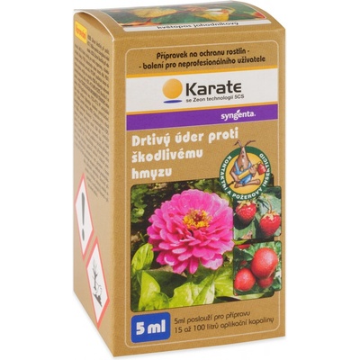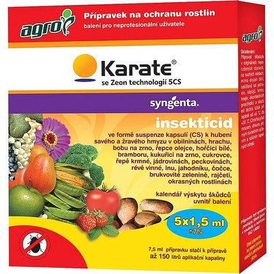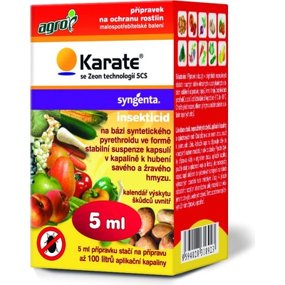 Karate se Zeon technologií 5 CS je insekticid na bázi syntetického pyrethroidu ve formě stabilní suspenze kapsulí v kapalině k hubení savého a žravého hmyzu v hrachu, bramboru, krmné řepě, jádrovinách, peckovinách, révě vinné, jahodníku, brukvovité zelenině, rajčeti,...