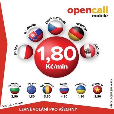 Předplacená SIM karta operátora OpenCall s kreditem 200 Kč pro volání do všech sítí v ČR a na Slovensko za 1,80 Kč/min bez nutnosti dobíjení.