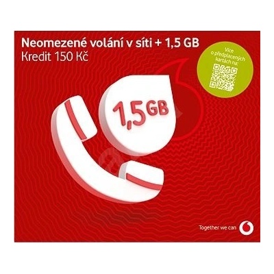 Balíček ke kartě 1,5 GB dat a volání v síti Vodafone neomezeně na první měsíc v ceně. 150 Kč extra kredit s platností 45 dní. Na první měsíc máte v ceně karty balíček 1,5 GB dat...