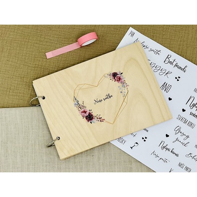 Dřevěné fotoalbum s rámečkem v deskách a s vlastním nápisem Vlepte na první stranu fotoalbu fotku, která dodá motiv celému fotoalbu a bude se krásně vyjímat v rámečku ve tvaru...