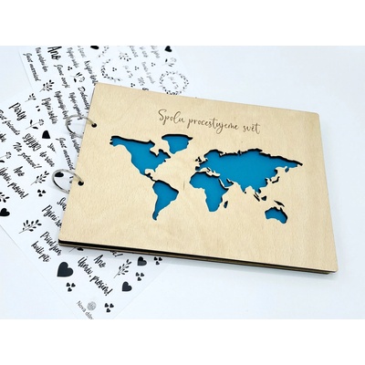 Fotoalbum s mapou světa Fotoalbum s motivem mapy světa se nejlépe hodí na fotky z dovolené. Na albu může být nápis "Spolu procestujeme svět" nebo jakýkjoliv jiný nápis, třeba...