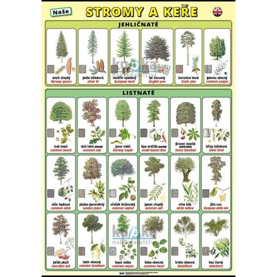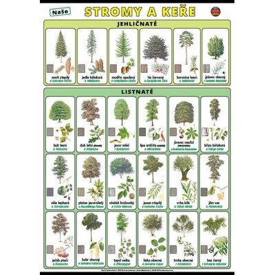 Názorné ilustrace 24 našich nejběžnějších stromů a keřů. - 6 jehličnatých stromů: smrk ztepilý, jedle bělokorá, modřín opadavý, tis červený, borovice lesní, jalovec obecný -...