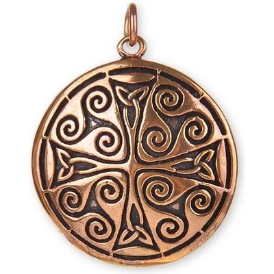 Bronzový přívěšek na krk s keltským křížem doplněným o triskelesy, které symbolizují v životě lidí vnitřní naplnění, cestu do vlastního nitra. Vhodný amulet pro milovníky keltské kultury a symboliky.