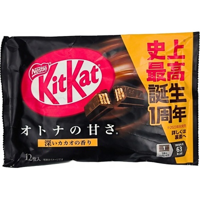 Oblíbená tyčinka Kit Kat s příchutí hořké čokolády. Složení: cukr, čokoláda, pšeničná mouka, kakaové máslo, palmojádrový olej, alkalicky zpracované kakao, mléčný tuk, sójový...