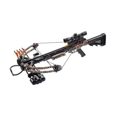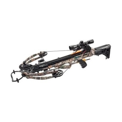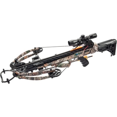 Sportovní lovecká kladková kuše s velkou napínací silou 185 LB v camo dizajnu lučiště, těla a černou posuvnou taktickou pažbou CQB. Díky takto silným ramenům a kladkám kuše...