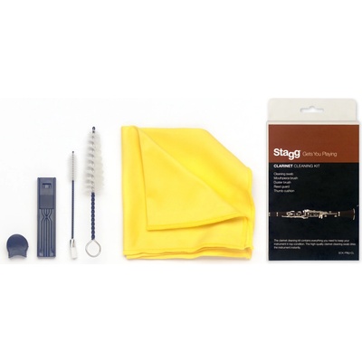 Sada pro údržbu klarinetů. Obsahuje čistící hadřík, kartáček na hubičku, univerzální kartáček, ochranný plastový kryt plátku, měkký návlek na palcovou opěru.