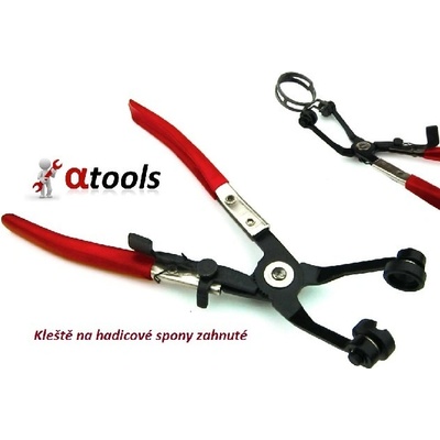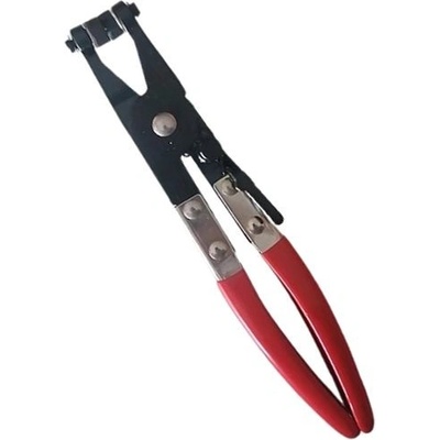 Kleště na hadicové spony se samosvorným uzamykáním. Zhotovení z kvalitní oceli s tvrdostí 40 HRC, délka kleští 230 mm. Zakončení čelistí průměru 12 mm s - profilem šířky 4...