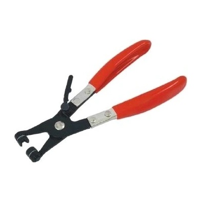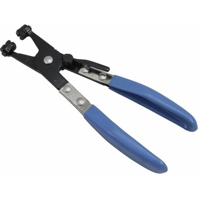 Kleště na hadicové spony se samosvorným uzamykáním. Zhotovení z kvalitní AISI 4130 oceli, délka kleští 215 mm. Zakončení čelistí - V profil, pro bezpečný úchop spon průměru 4,5 mm