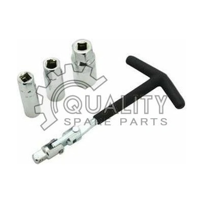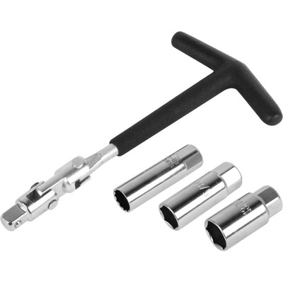 Sada kovového klíče k montáži, nebo demontáži zapalovacích svíček automobilu. Kloubová redukce a ergonomické gumové zakončení klíče usnadňuje použití i v těžko dostupném místě...