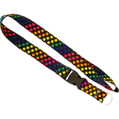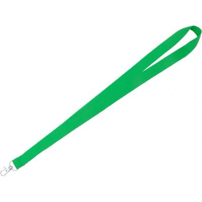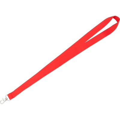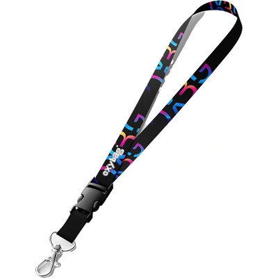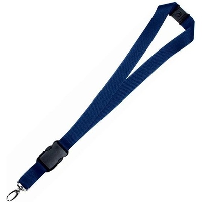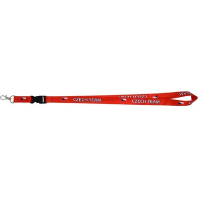Širší polyesterová šňůrka na krk o šířce 25 mm má odnímatelnou koncovkou, bezpečnostní uzávěr za krkem a karabinku na klíče. Délka delší části šňůrky od karabiny ke sponě je 48...