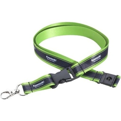 Praktická klíčenka na krk. Černá se zelenými proužky a bílým logem Kawasaki Racing Team.