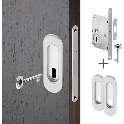 Výhodná sada dvou úchytů a zadlabacího zámku pro posuvné dveře. Dostupné v široké škále barevných provedení. Varianty s WC kličkou, obyčejným klíčem nebo stavební vložkou -...