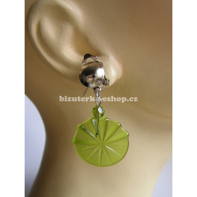 Naušnice klipsy, průměr kruhu 4,7 cm. V případě zájmu možnost výměny kovových části za stříbrnou barvu. Ve skutečnosti o něco světlejší zelená barva.
