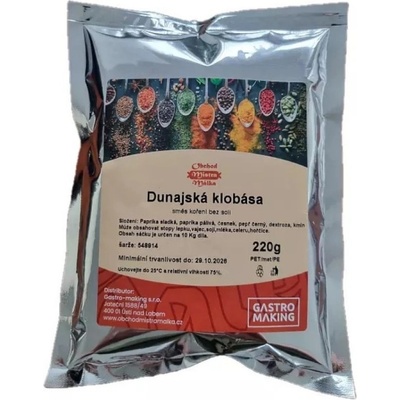 Dunajská klobása - směs koření Složení: koření (paprika sladká, paprika pálivá), stabilizátor E 450, maltodextrin, extrakty koření (paprika, kmín, česnek), sůljedlá (max. 3 %), antioxidant E 300, regulátor kyselosti E 575, látky zvýrazňující chuť a vůni E 621, E...
