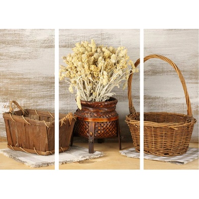 Třídílný obraz s motivem košíků venkov. 100% kvalita tisku, odolný povrch bez nutnosti chránit sklem. Obraz má velmi moderní dřevěné rámy v hnědé barvě o šířce pouhých dvou...