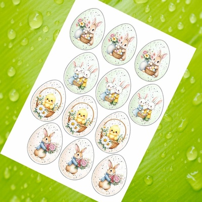 Zajíčci a kuřátko – košíky – velikonoční vejce 7 cm (12 ks) Jedlý tisk s jemnými velikonočními motivy zajíčků a kuřátka v košících, doplněnými o květiny a pastelové tóny.Arch...