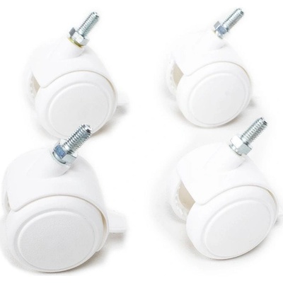 Sada 4 koleček o průměru 5 cm v bílé barvě. Kolečka lze snadno přidělat k postýlkám z naší nabídky. Každé kolečko je opatřeno brzdičkou.