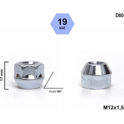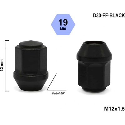 Matice pro kola M12x1,5 mm s kuželovou dosedací plochou typ D60DF-BLACK jsou určené pro plechové disky značky automobilu FORD, VOLVO. SPECIFIKACE Dosedací plocha: kužel 60°...