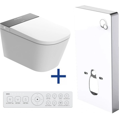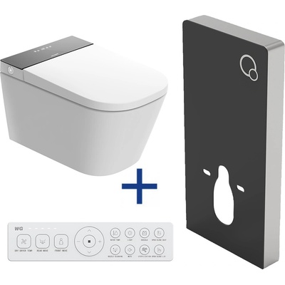 Designová elektronická sprchovací toaleta s dálkovým ovládáním zavěšená na samonosným 11 cm hlubokým WC modulu připevněným ke stěně. Nosnost 160 kg. Celková hloubka sestavy 69...