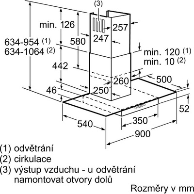 Montáž pod skříňku Provozní kontrolka 3 rychlosti Výkon odtahu: Volný výstup, m³/h: 422 Max., m³/h: 375 Min., m³/h: 141 Hlučnost dB: 60 - 72 2 integrované LED žárovky 3...