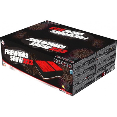 Složený multikaliberní ohňostroj FIREWORKS SHOW 223 RAN Složený ohňostroj s 223 ranami. Ohňostroj obsahuje 64 rovných efektů 20 mm, 70 šikmých efektů 20 mm, 56 rovných efektů 25...