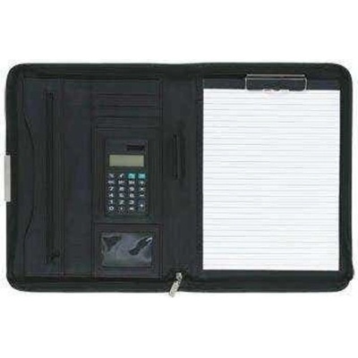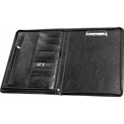 Konferenční desky z černé syntetické kůže uzavíratelné na zip. Obsahují přihrádky na psací potřeby, dokumenty a vizitky. Součástí je poznámkový blok a kalkulačka.