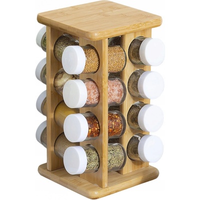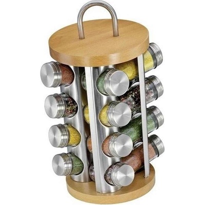 Otočný stojan na kořenky vyrobený z nerez oceli v kombinaci se dřevem. - Materiál: Nerezová ocel / dřevo - Stojan obsahuje 16 kořenek ze skla s víčky, bez koření - Otočný na...
