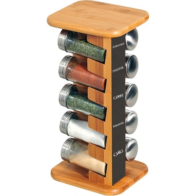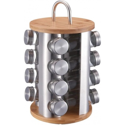 Otočný stojan na kořenky vyrobený z nerez oceli v kombinaci se dřevem. - Materiál: Nerezová ocel / dřevo - Stojan obsahuje 16 kořenek ze skla s víčky, bez koření - Otočný na platformě s kuličkovým ložiskem - Včetně popisovatelných samolepek - Ø 17,5 cm, výška 35,5...
