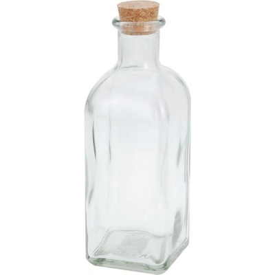 Skleněná hranatá láhev na olej či ocet s korkovou zátkou, objem 500ml, výška 19cm. Vhodná též i na různé tekutiny nebo nápoje.