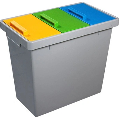 vhodné na třídění odpadů v domácnostech, kancelářích, školách apod. šedá nádoba (z polyethylenu) na třídění odpadu víko rozdělěno na 3 barevné víka dělící nádobu na 3 koše...