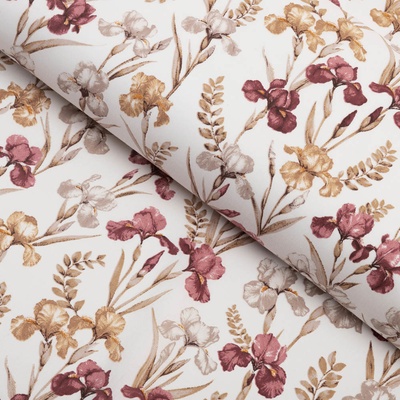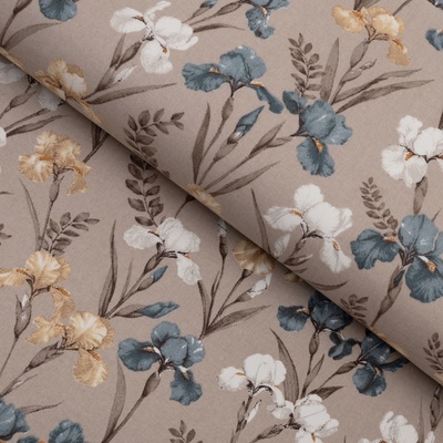 100% bavlněné plátno se vzorem modro-béžovo-bílých kosatců na šedobéžovém podkladu. I přes svou jemnost je látka dostatečně pevná a po vyprání drží tvar a barevnost, také...
