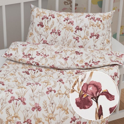 Dětské bavlněné povlečení do postýlky se vzorem vínovo-béžových kosatců na bílém podkladu. Je ušité z hustě tkaného 100% bavlněného plátna s certifikátem zdravotní nezávadnosti...