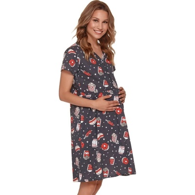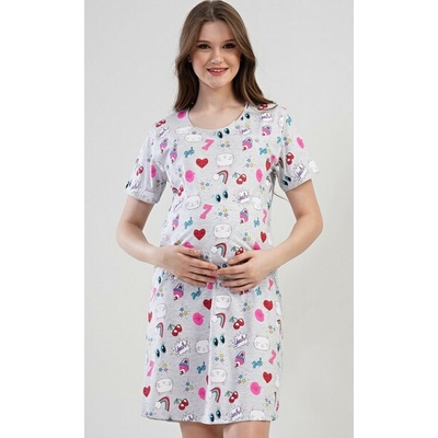 Obrázková mateřská noční košile, s oboustranným rozepínáním výstřihu, na knoflíčky, ulehčí kojení děťátka. Krátký rukáv, délka nad kolena.