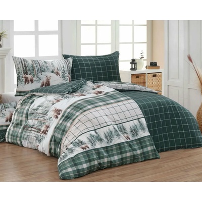 Bavlněné povlečení zachycuje na vrchní straně motiv zimní krajiny s obrázky medvědů, spodní stranu povlečení zdobí kostkovaný vzor v bílé kontuře na tmavě zeleném podkladu....