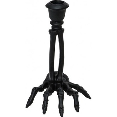 Černý svícen na stůl v podobě černé kostry ruky Kosterní svícen v černé pryskyřici je velmi dekorativní a originální výzdoba na tématické Gotik nebo halloweenské párty. Rozměry: přibližně 12 x 11,5 x 16 cm. Výška (bez svíčky): 16 cm.