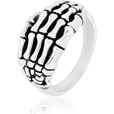 Stříbrný prsten 925 - lesklá ramena, ozdobně vyřezávaná a patinovaná ruka kostlivce.