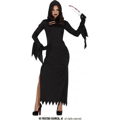 Dámský kostým šaty Assassin (nájemný vrah) v černé barvě s kapucí a pilovitě zubatými okraji, nůž není součástí balení, velikost M (38-40).