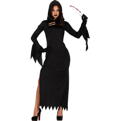 Dámský kostým šaty Assassin (nájemný vrah) v černé barvě s kapucí a pilovitě zubatými okraji, nůž není součástí balení, velikost L (40-42).