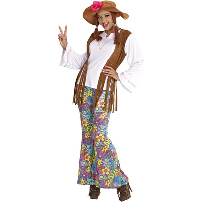 Dámský kostým Hippies Woodstock vel. XL skvělý kostým Hippie pro ženy ve velikosti XL. Součástí kostýmu je plátěná vyšívaná halena s vestou, kalhoty a klobouk s vlasy....