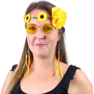 Parádní sada hippies, ve které najdeš čelenku se žlutými kvítky, dlouhé žluto-oranžové náušnice a brýle lenonky. Perfektní doplňky na karneval či párty. Karneval neboli...