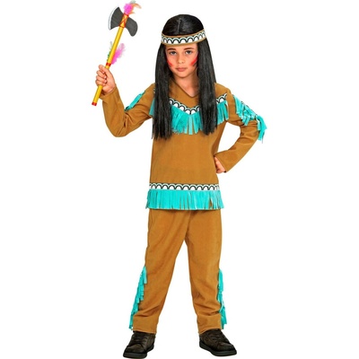 Dětský kostým Indián hnědý 128 (5-7 let) Indiánská halenka, indiánské kalhoty a indiánská čelenka s pérem. Kostým indián v hnědé barvě zdobený světle modrými prvky. Indiánský...