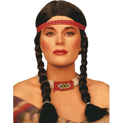 Paruka indiánky s culíky a čelenkou. Důležitý doplněk indiánského kostýmu Rybany. Barva: černá Materiál: 100% polyester Určeno pro: dámská Typ paruky: dlouhá s culíky...
